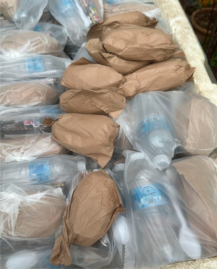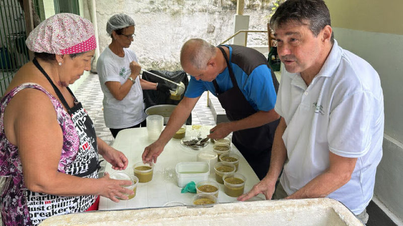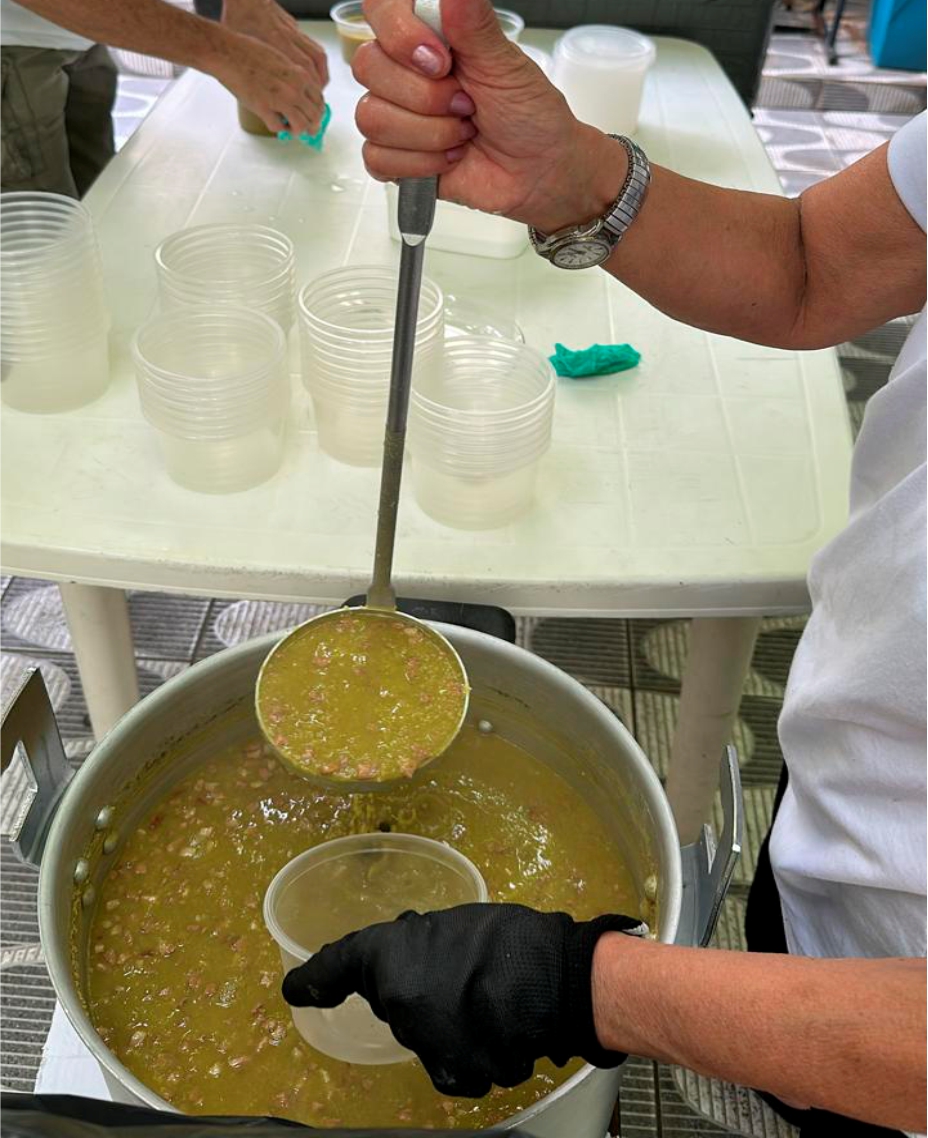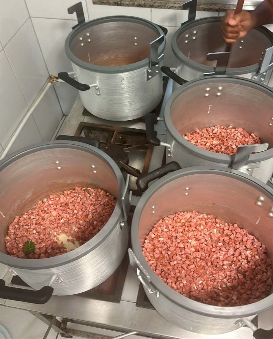 Para a sopa, utilizamos produtos de ótima qualidade, a fim de fazermos com esmero e carinho uma refeição nutritiva e saborosa, distribuída em embalagens plásticas descartáveis acompanhas de pão, água mineral e pacote de biscoito recheado.